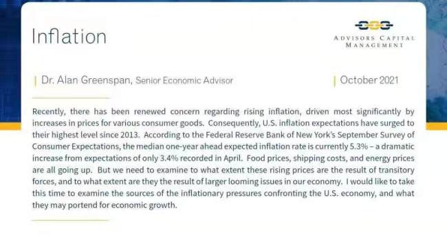 У своїй статті, що була опублікована консалтинговою фірмою Advisors Capital Management, Грінспен написав, що значне зростання інфляції, викликане накопиченням державного боргу та іншими глибокими стресами. Тенденція до того, що інфляція буде значно вище 2-відсоткового цільового показника ФРС, зберігається.